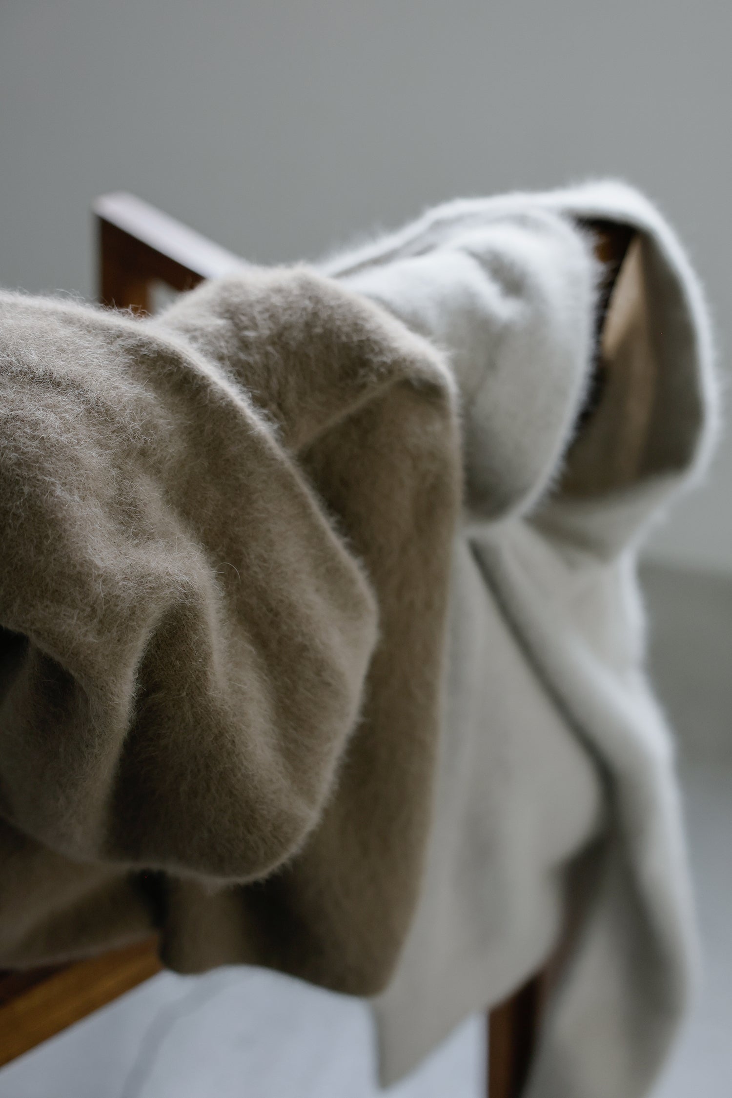 The cardigan is made from a new lightweight, warm fabric that is very pleasant to the touch, combining brushed fox fur and cashmere to create a soft fabric.