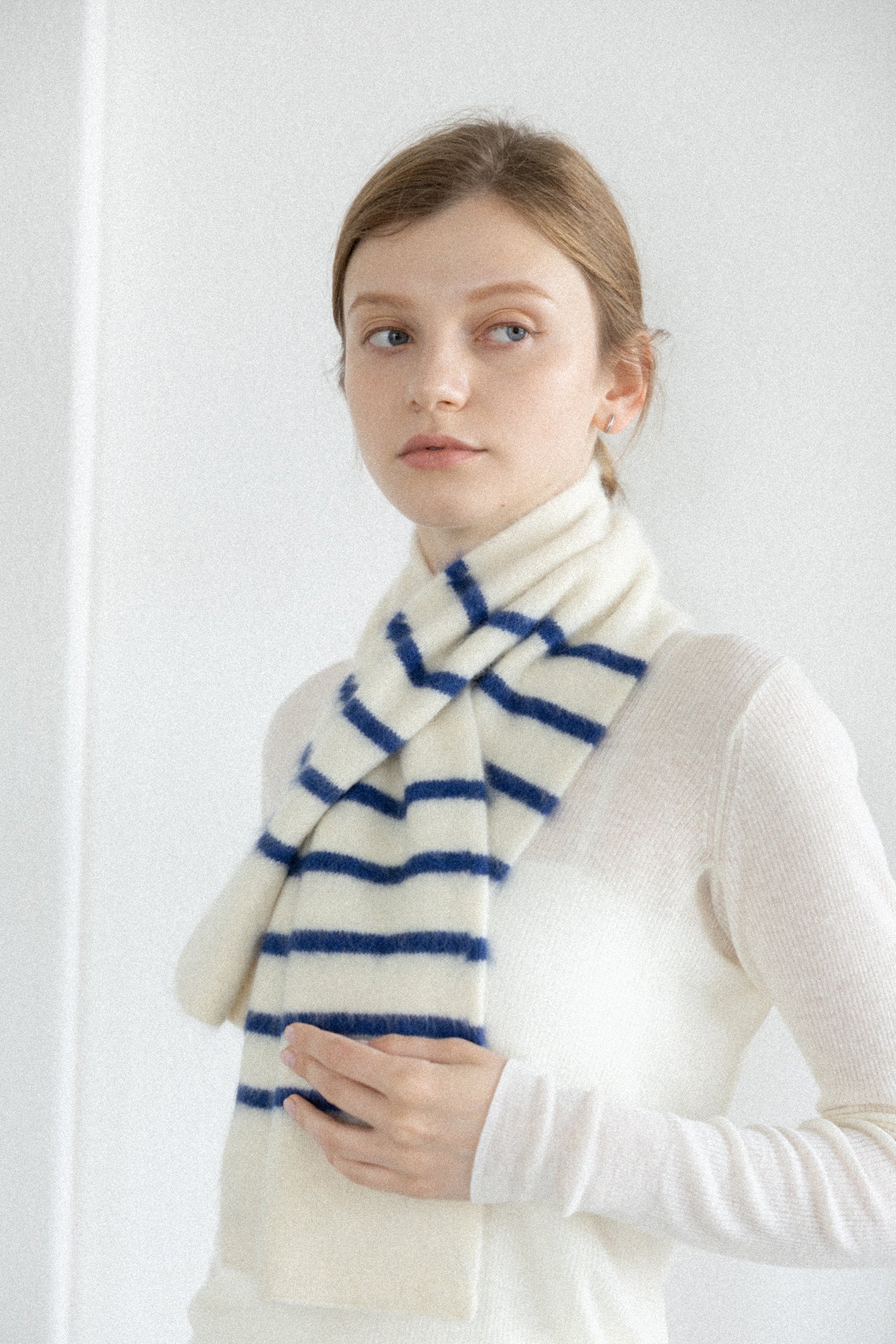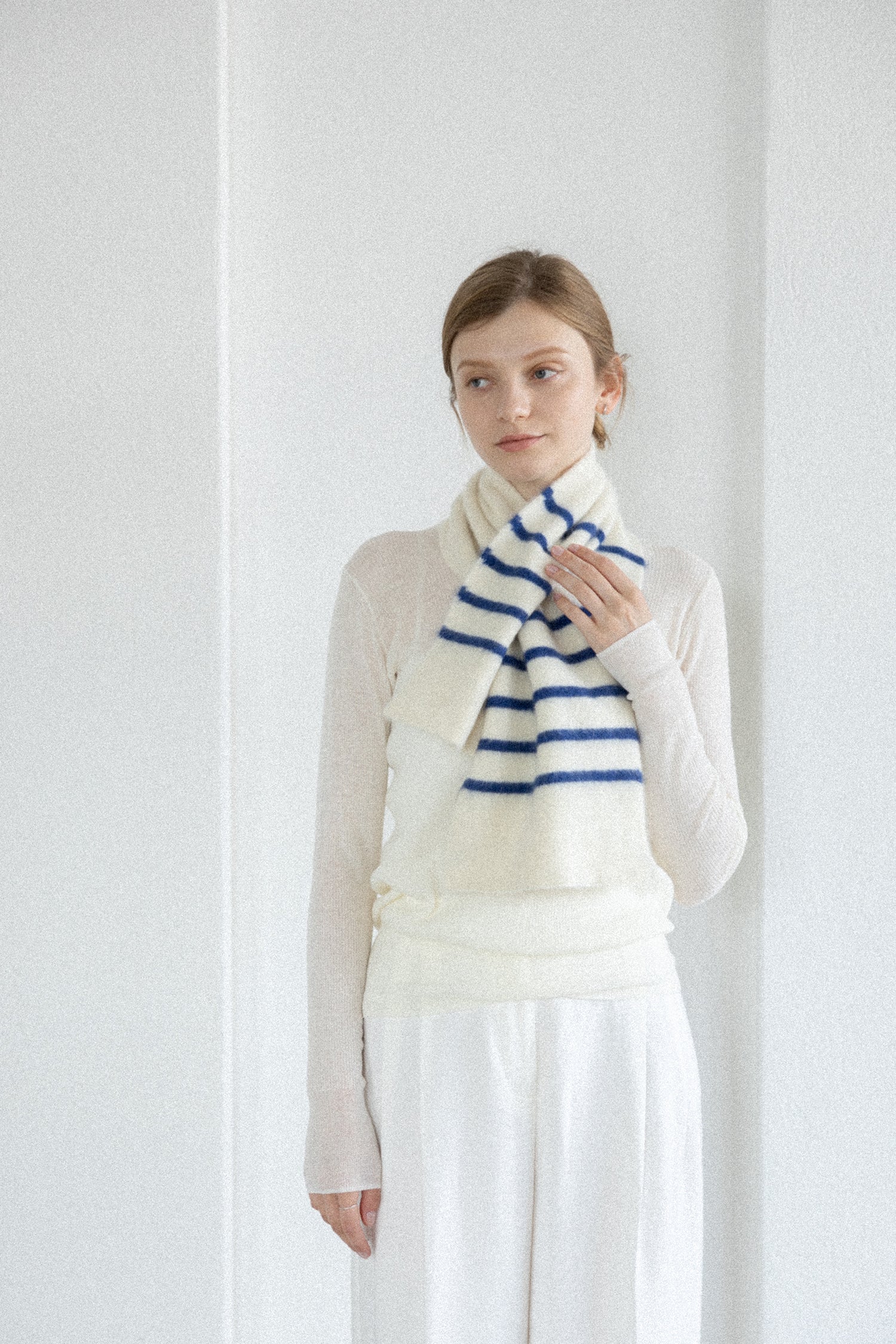 片側の穴にもう片側を差し込むだけで装着、サッと首元にボリュームと暖かさをプラスできます。
