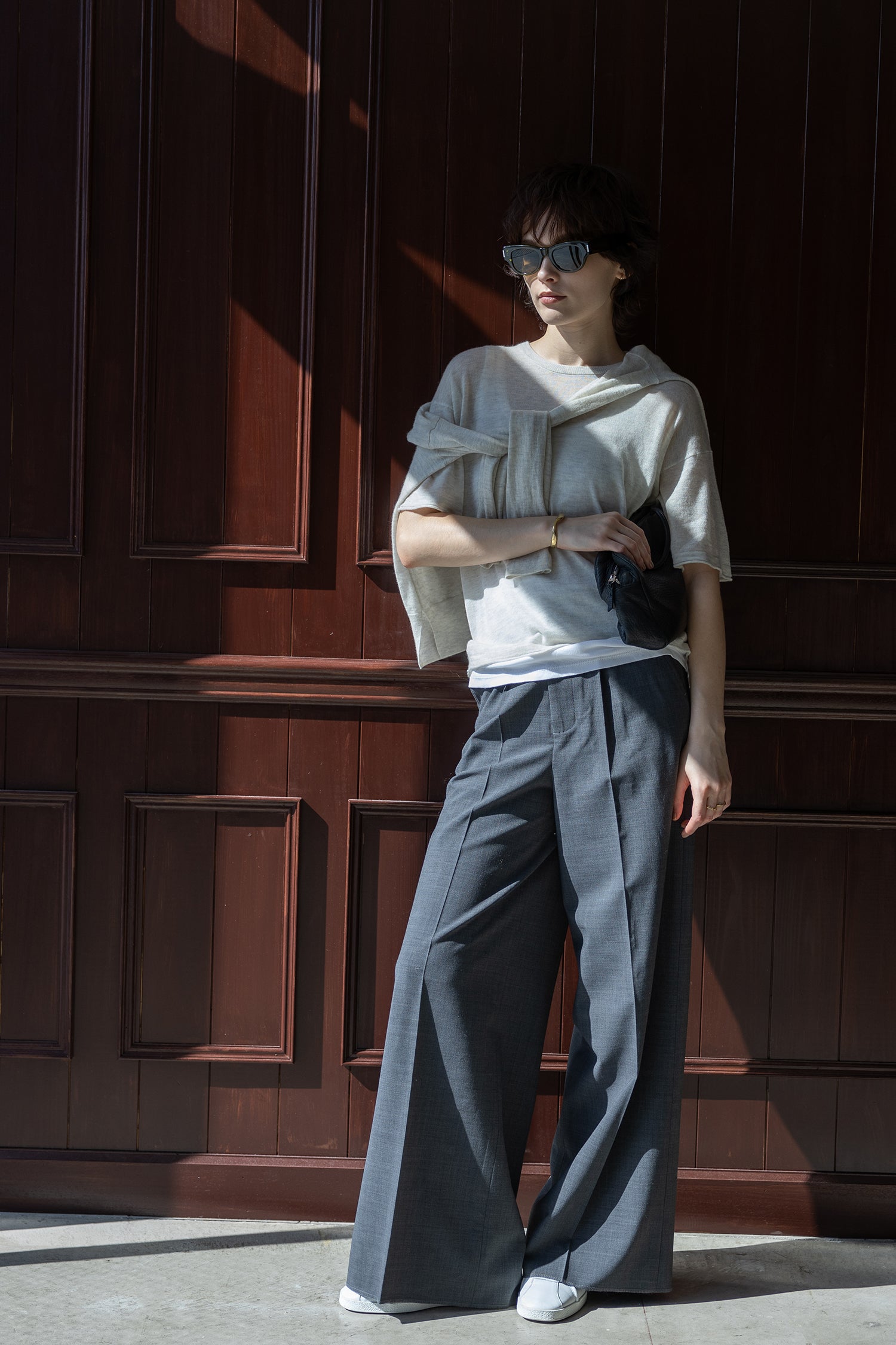 ゆったりとしたTシャツとワイドパンツの組み合わせでは、快適な着心地と大人の余裕を両立。