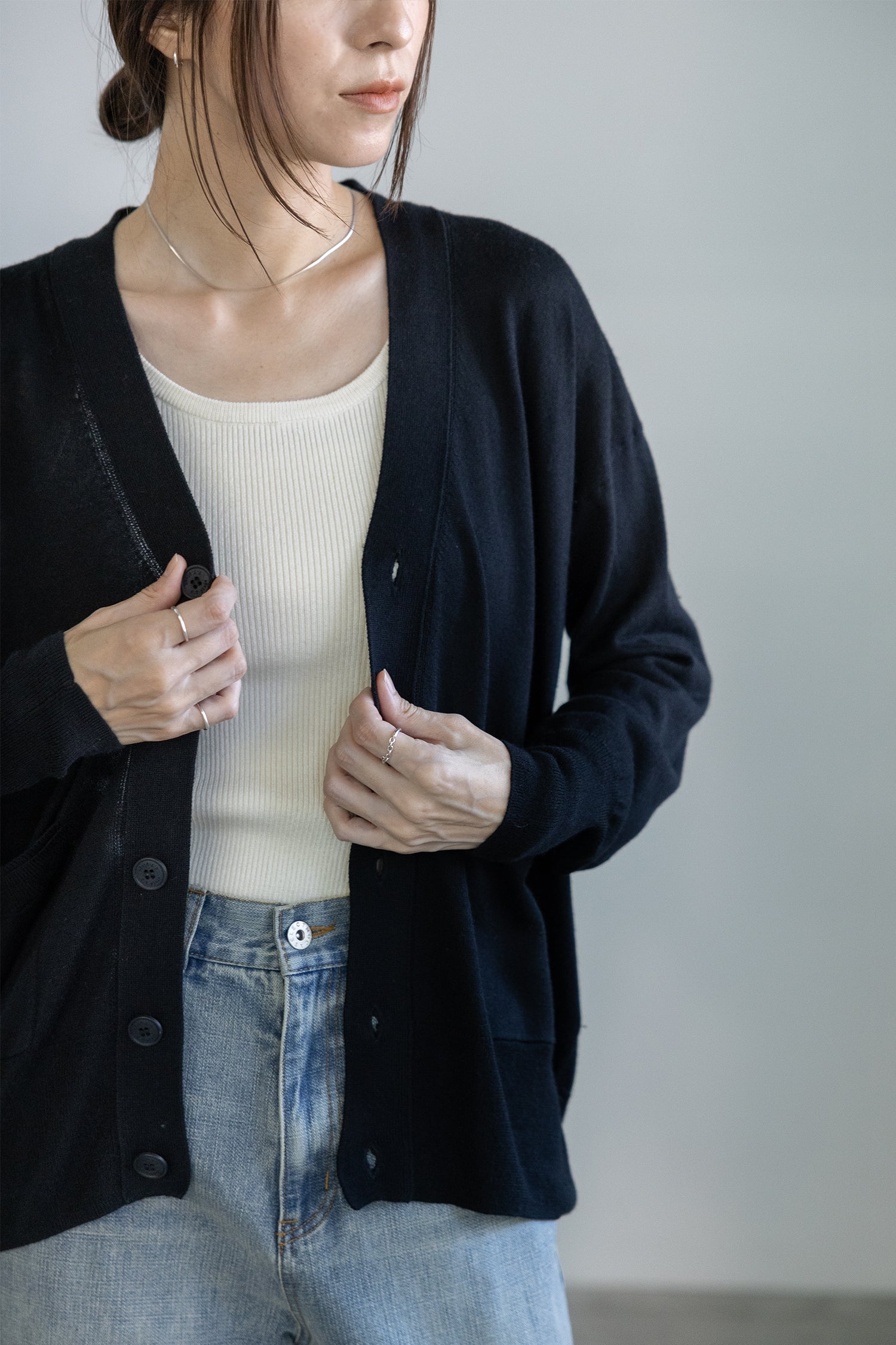透け感がなく、しっかりとしたリブで、一枚でも、重ね着でもお勧めです。前後着用可能で衿ぐりをコーディネートによって変えることが出来ます。