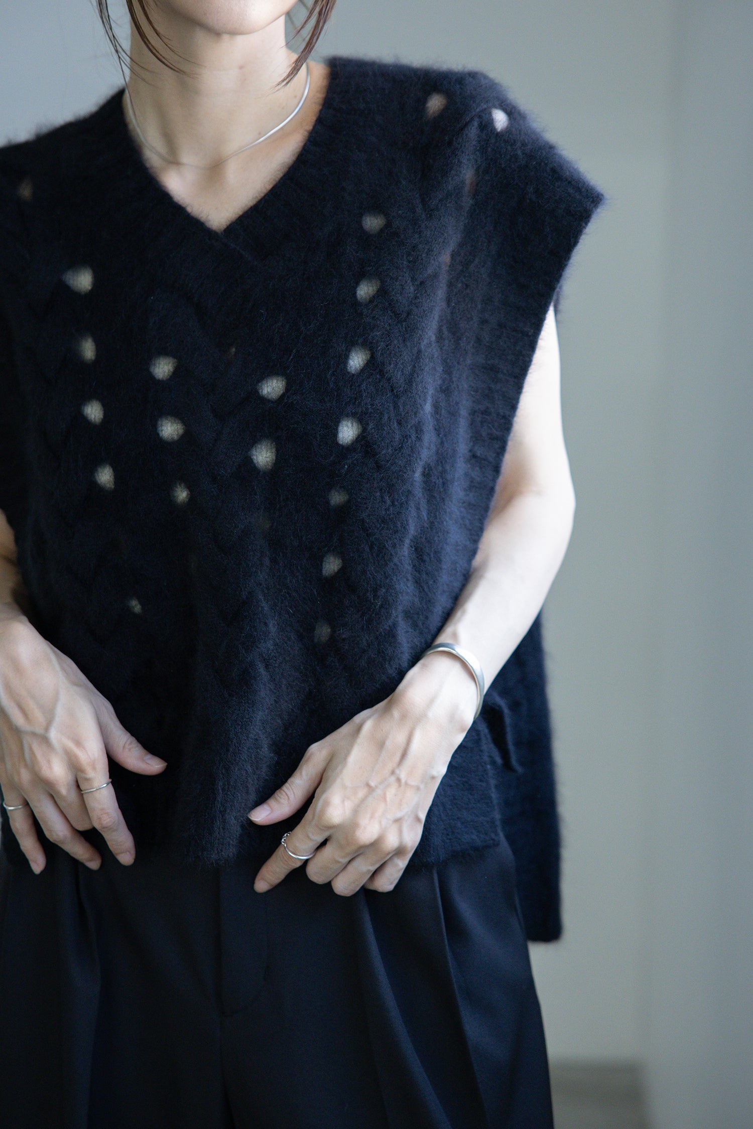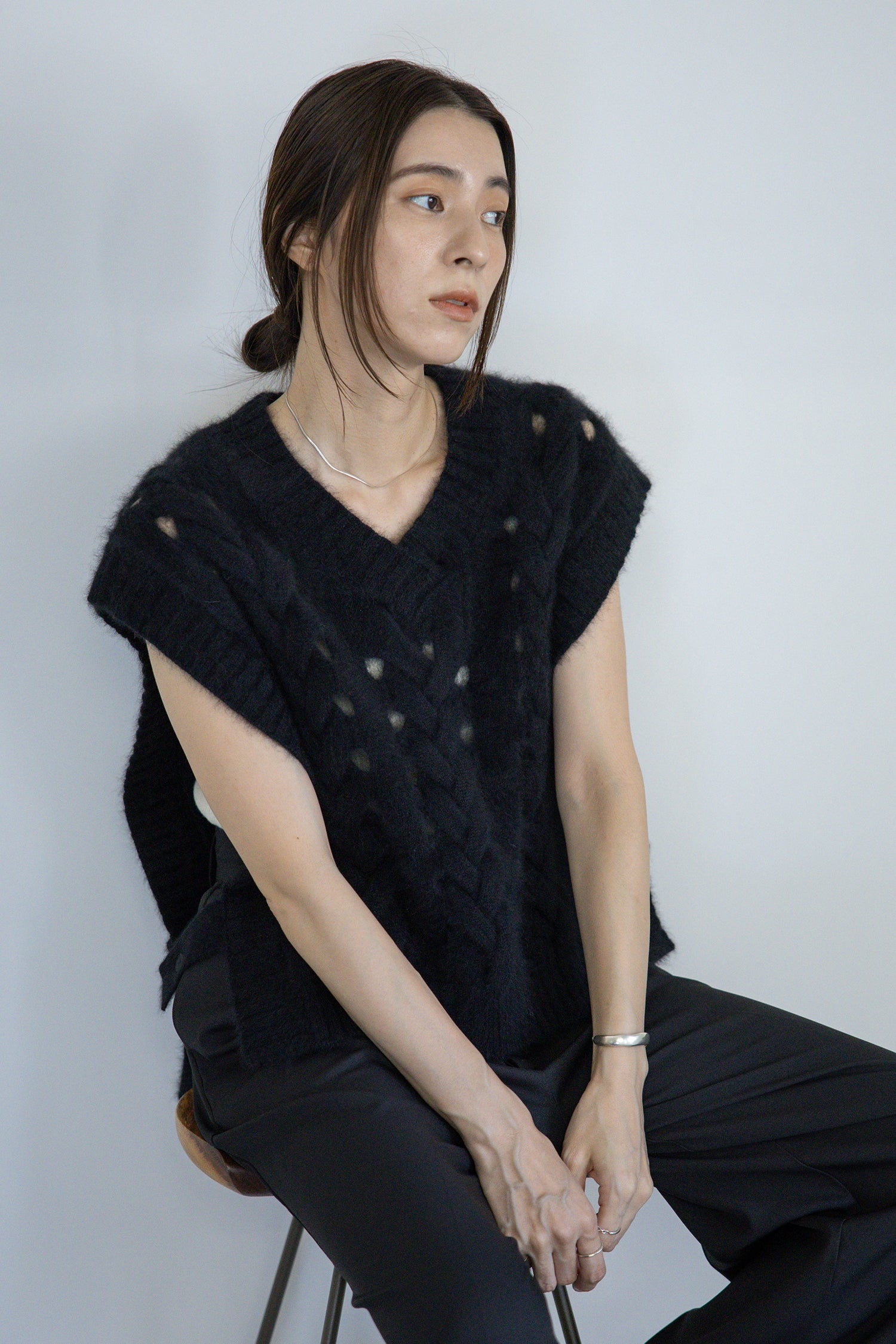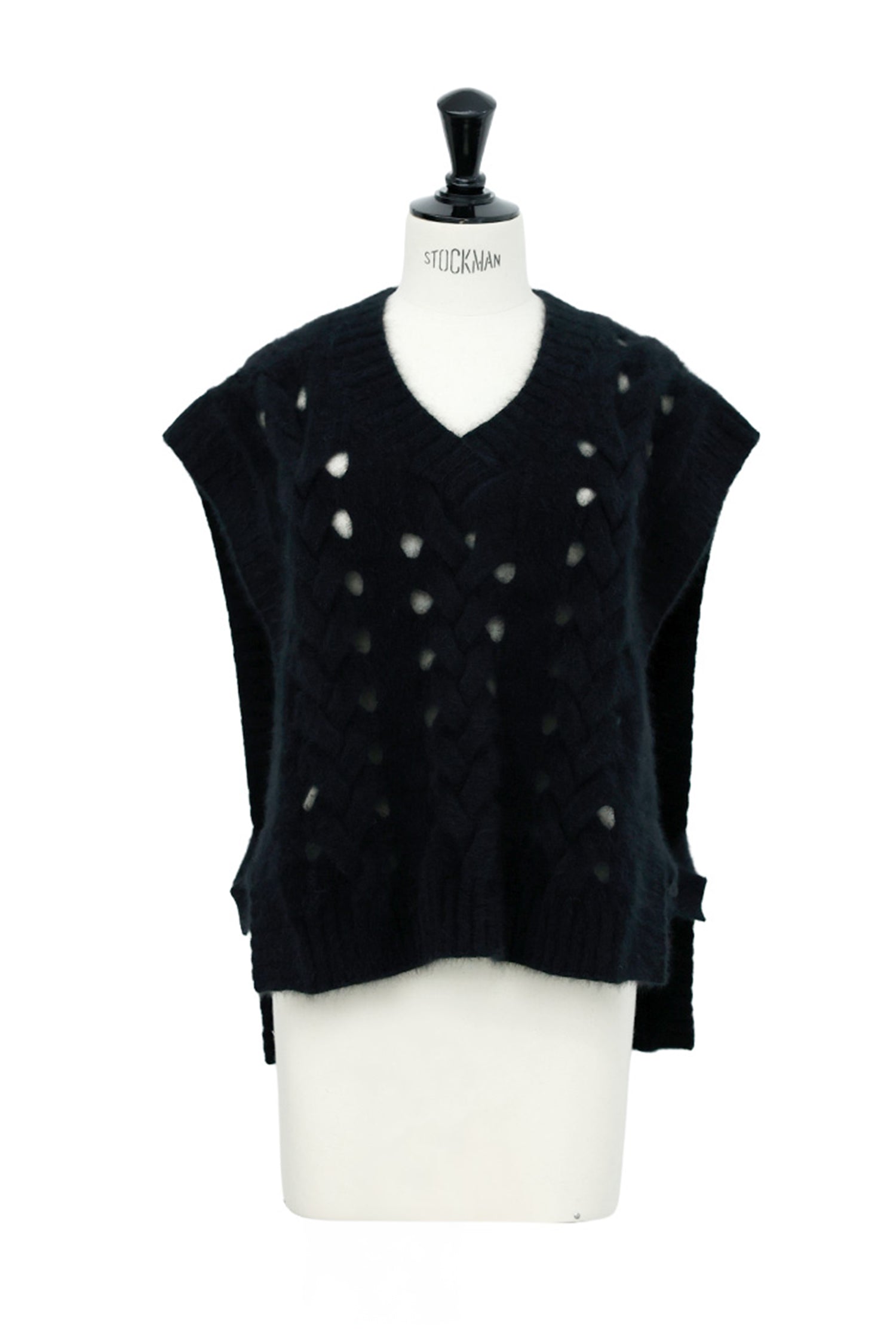 表情豊かなケーブル編みの他にはないユニークなデザインのニットベスト。