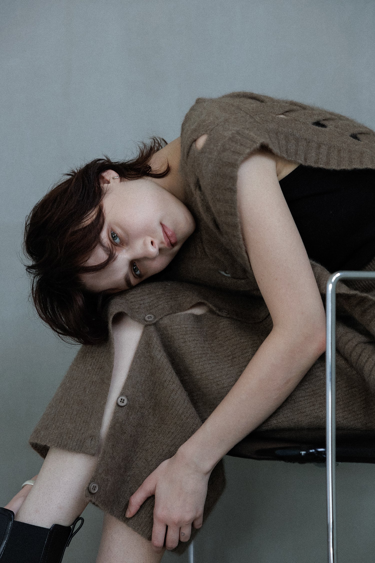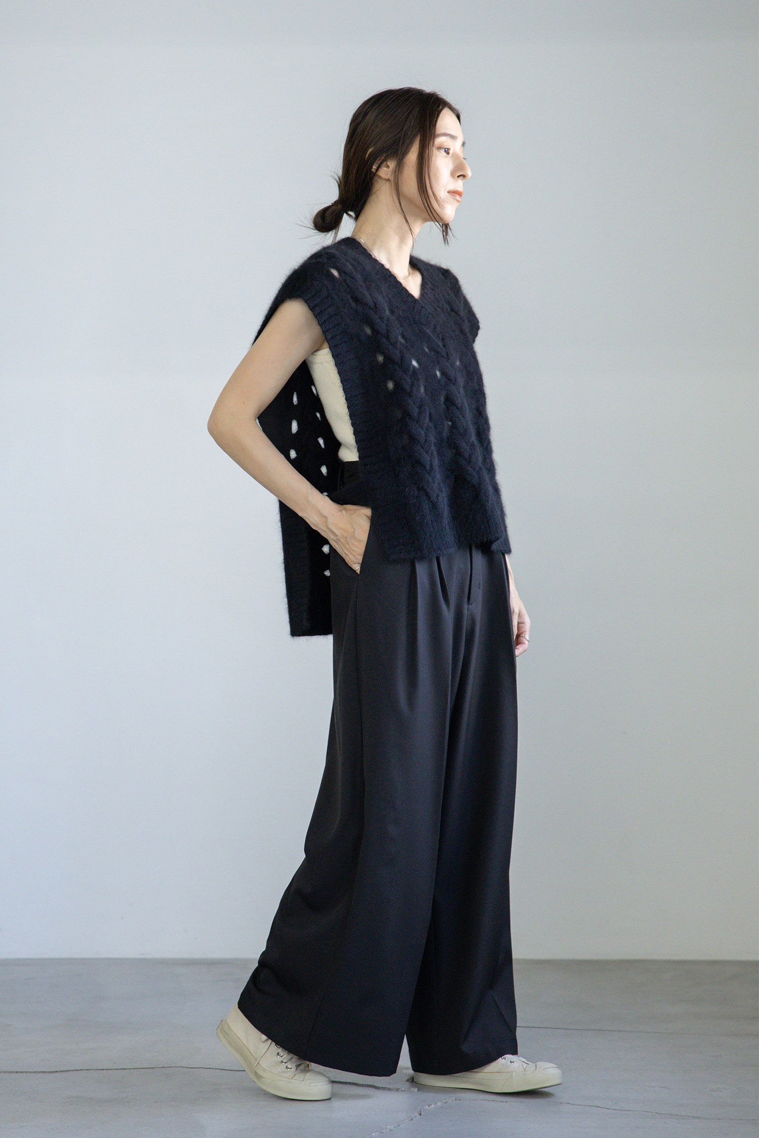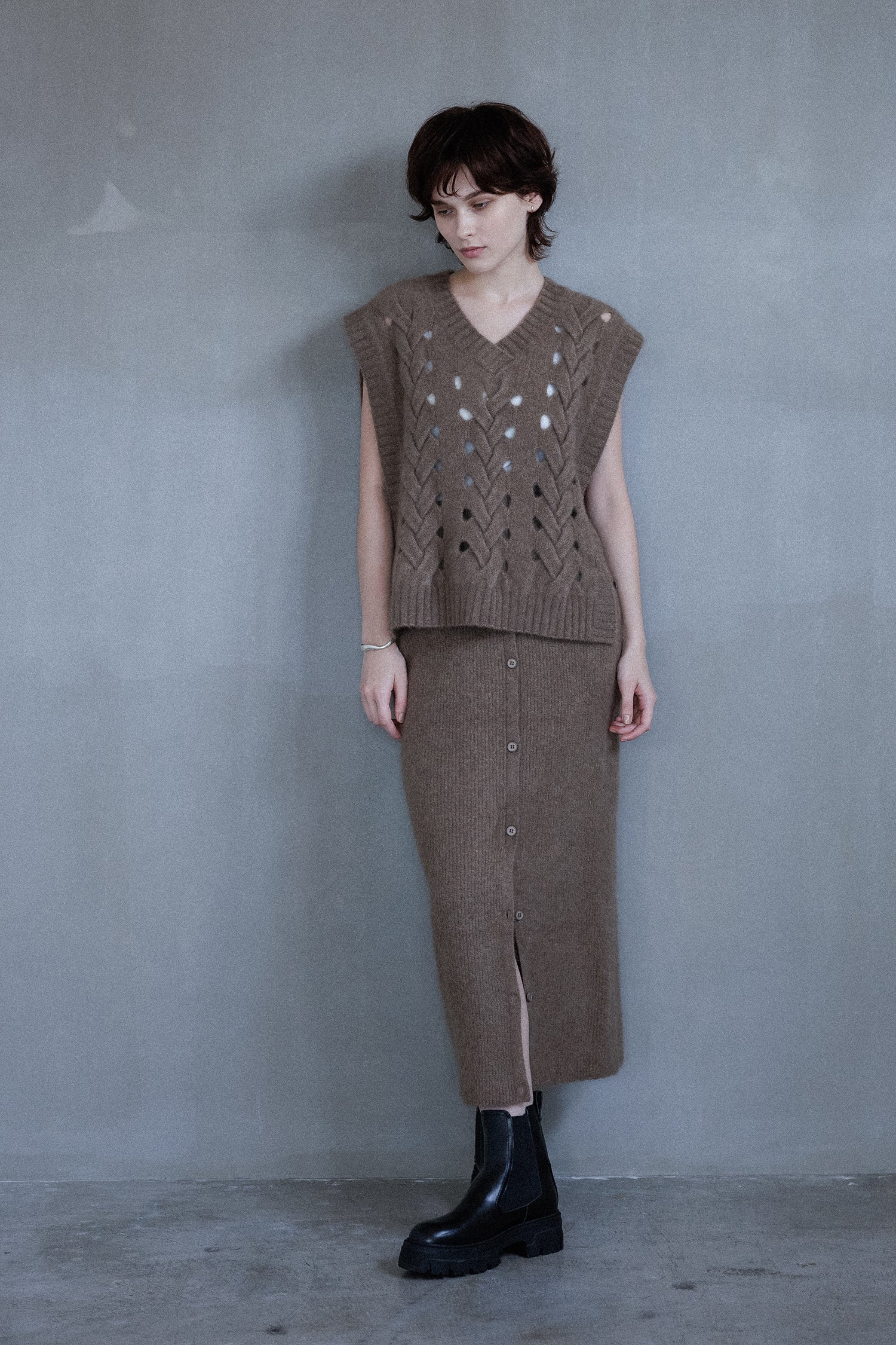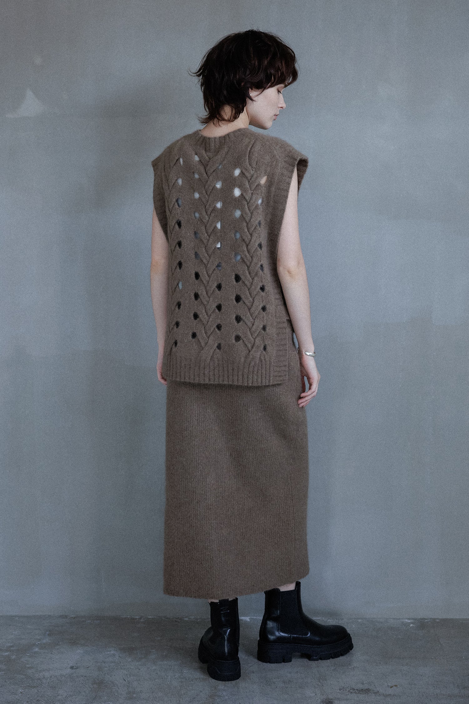 表情豊かなケーブル編みの他にはないユニークなデザインのニットベスト。
