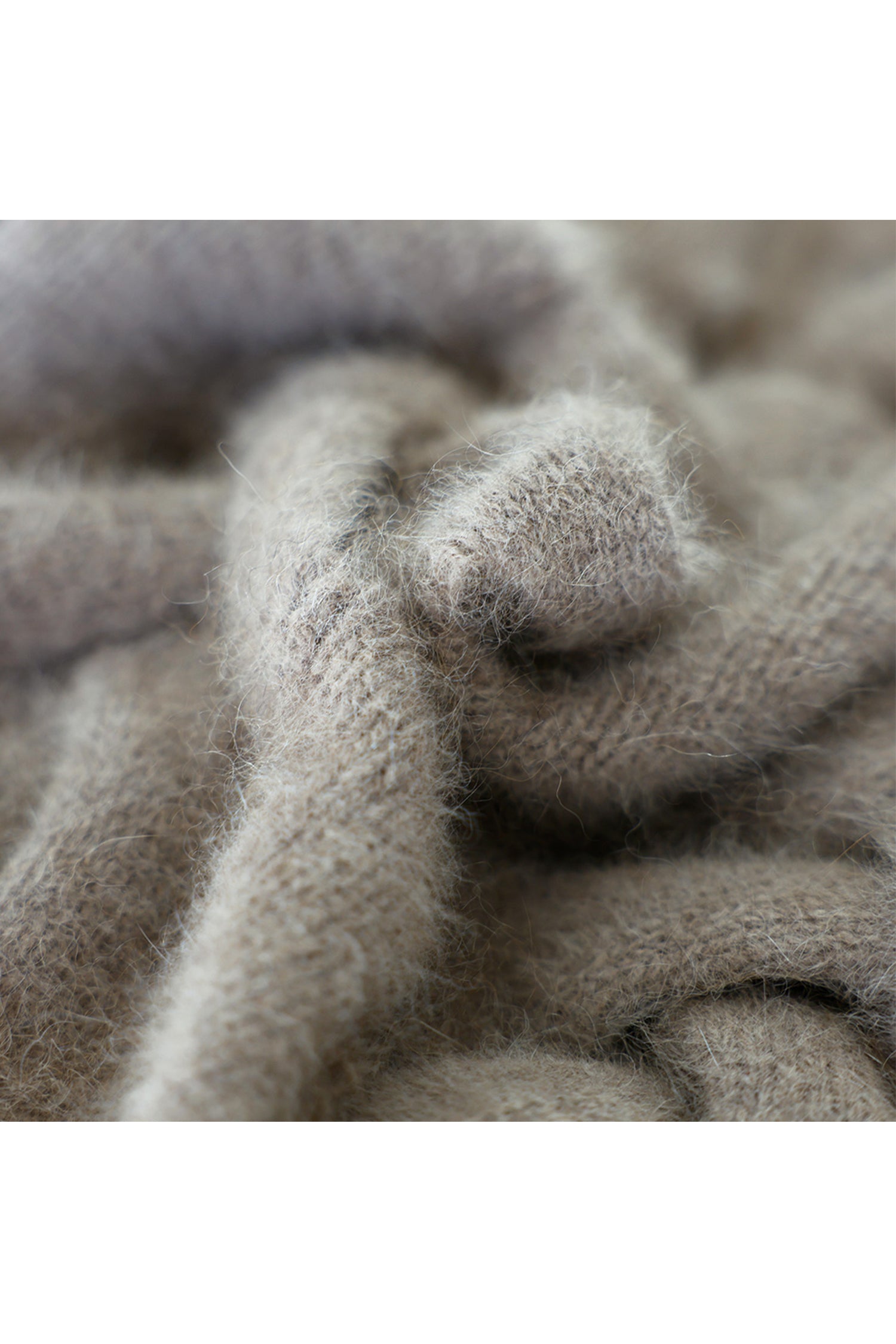ラクーンとフォックスの毛をそれぞれブラッシングする事でとれた素材をナイロンで撚りをかけて出来た素材です。