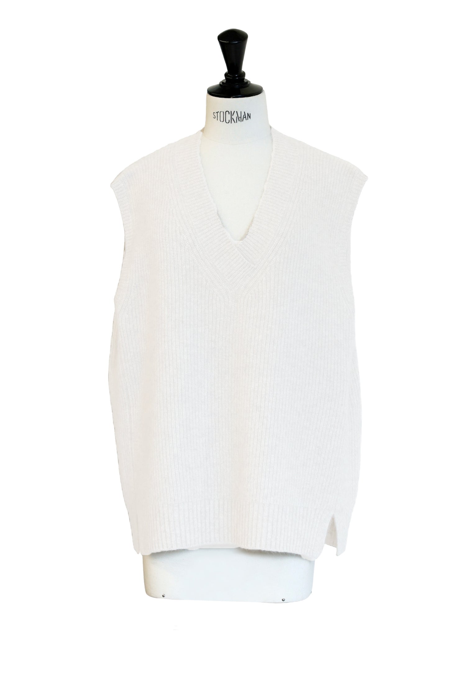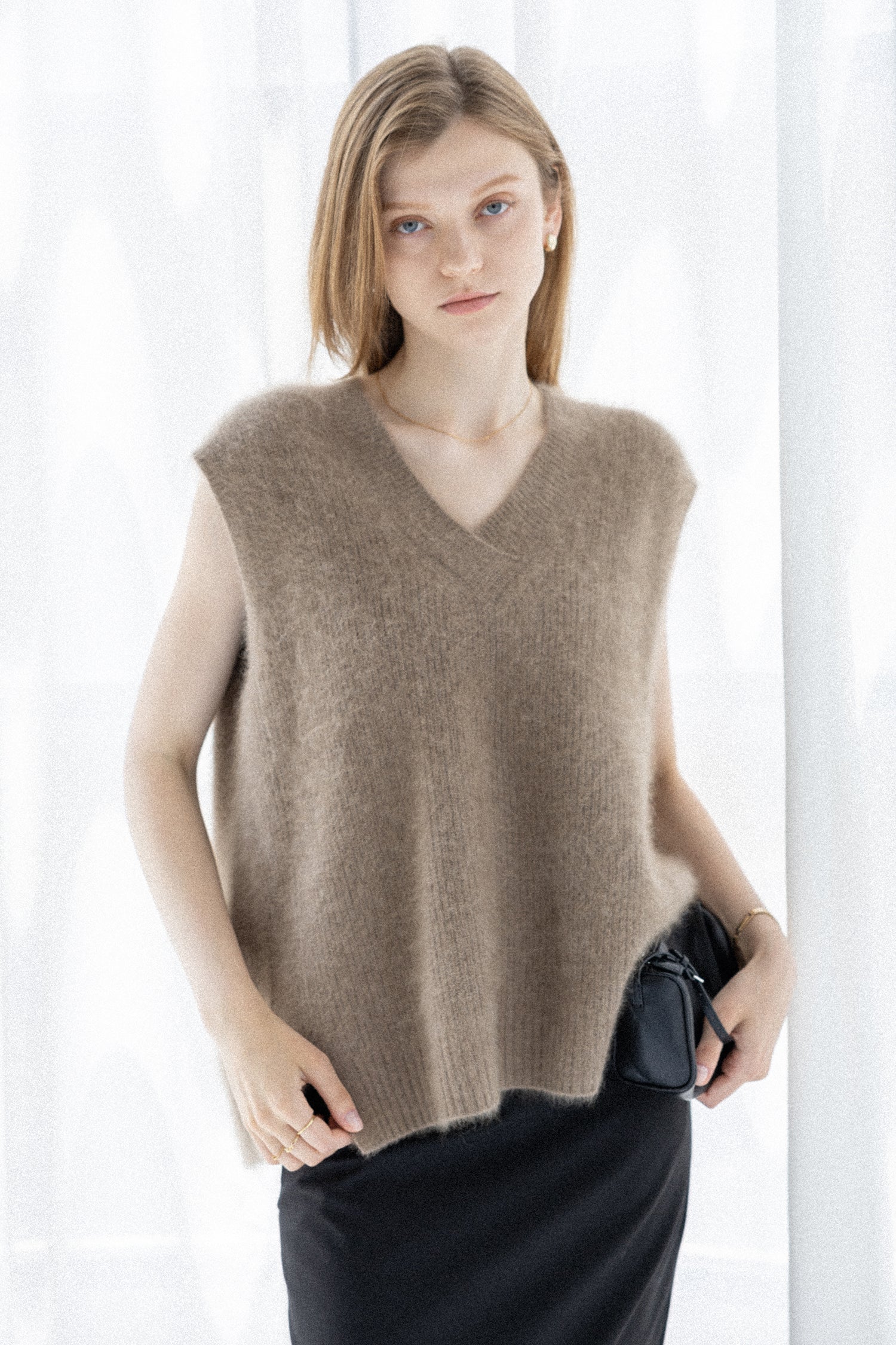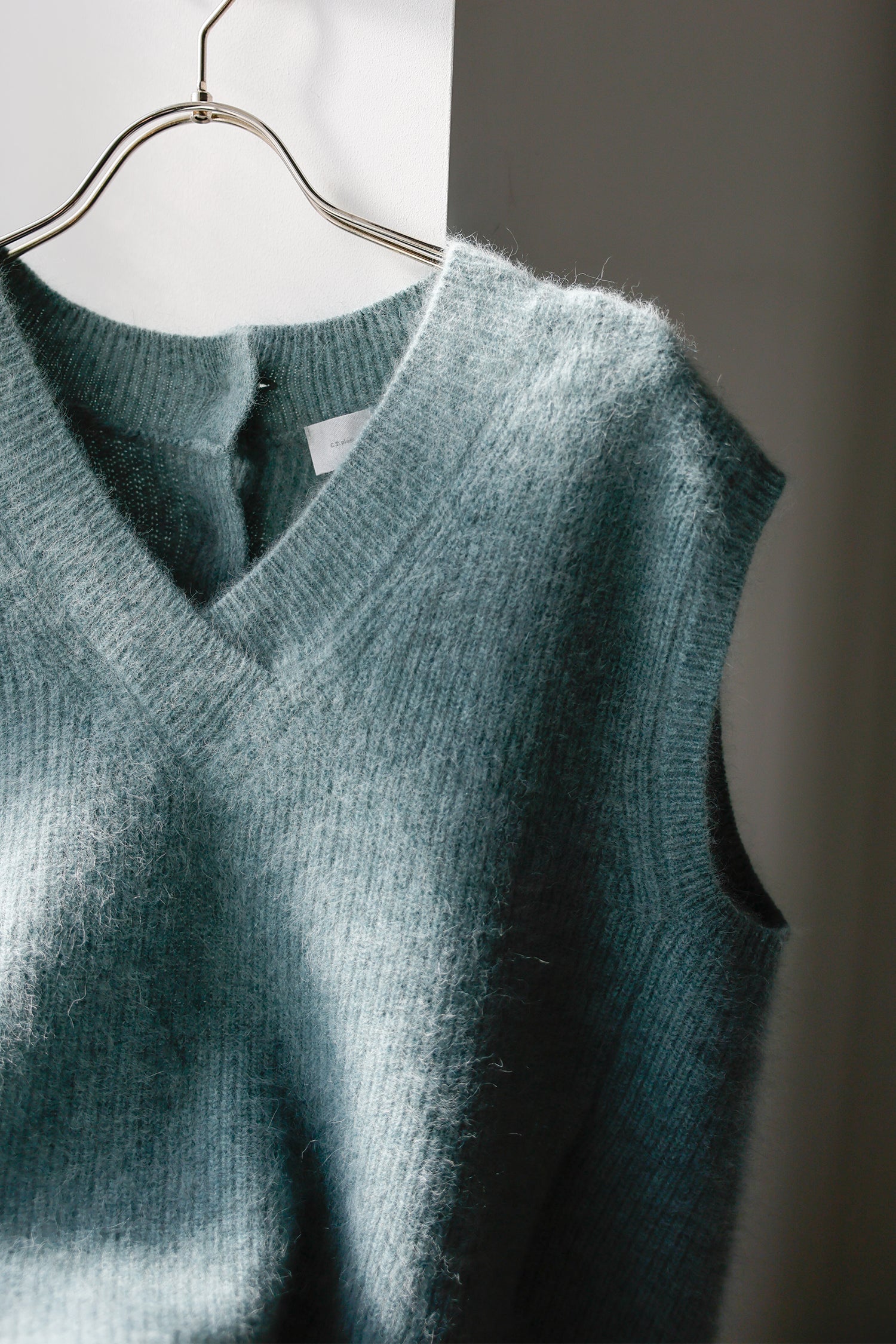 ふんわりとした風合いと、後ろ姿が可愛いボタンディテールが魅力のニットベスト。