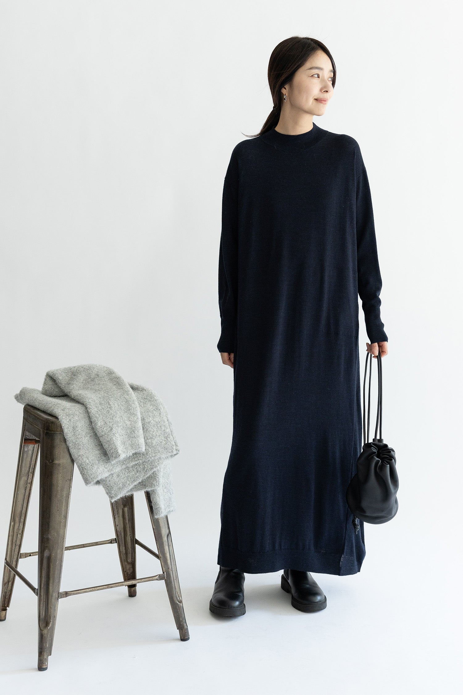 Cette robe a une silhouette trapèze avec une encolure haute et des changements de tricot sur les côtés.